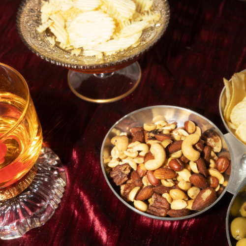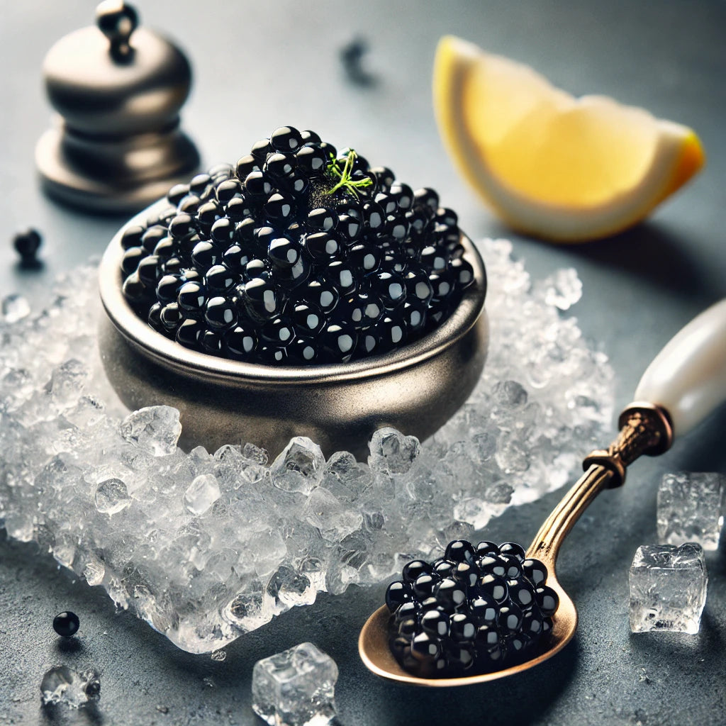 Siberian Reserve – 30 g, served with pickled silver onion, sour cream, and blinis.