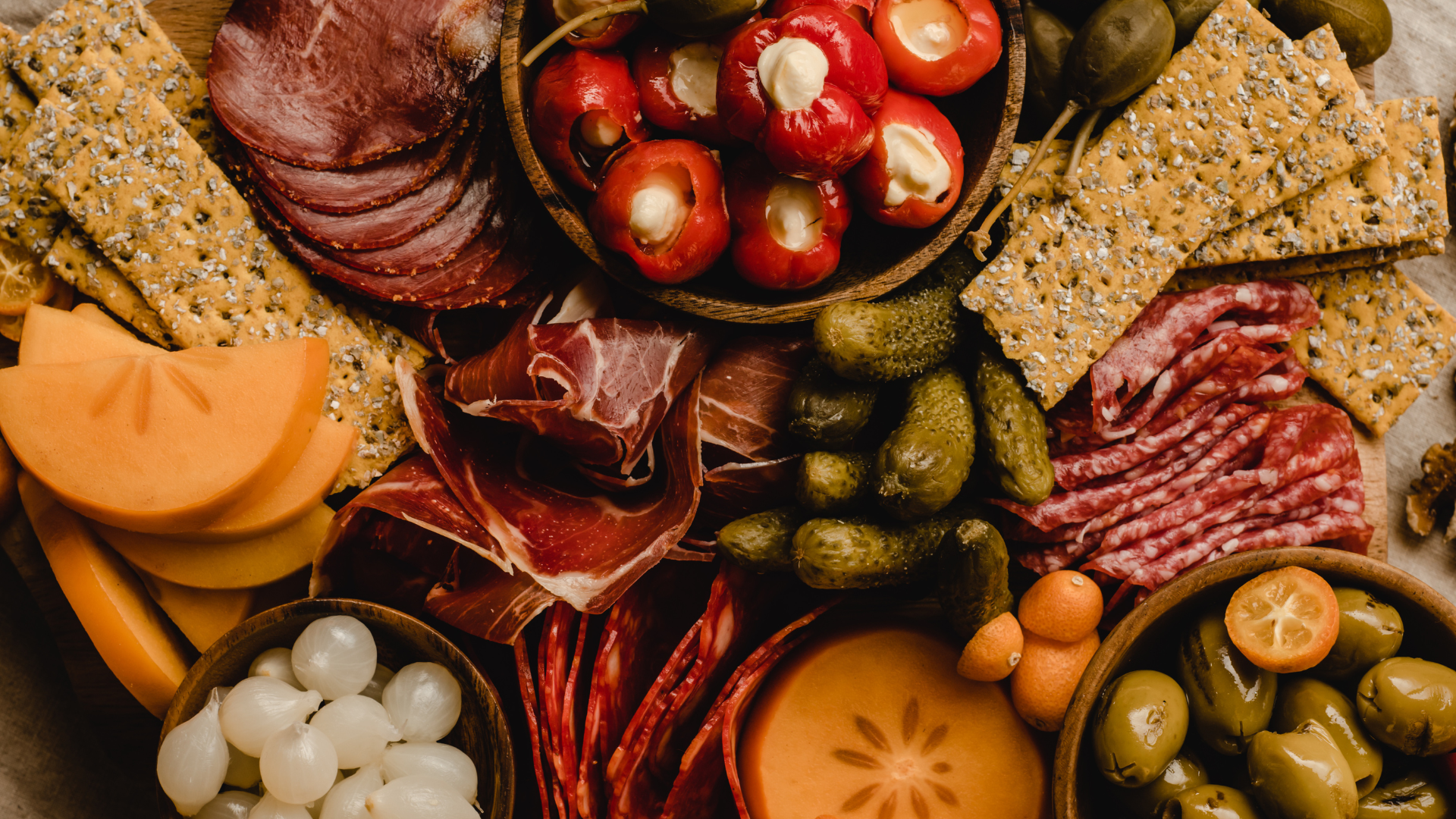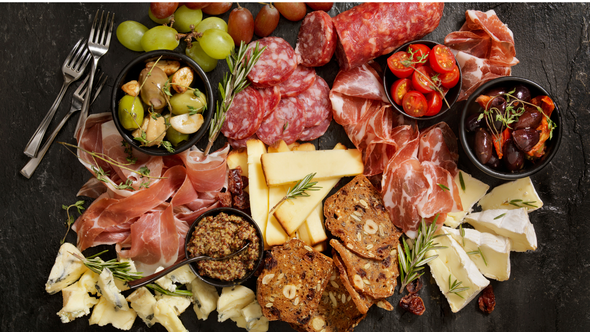 Two cheeses and two cured meats with marmalade, pickles, and grilled artisan bread.